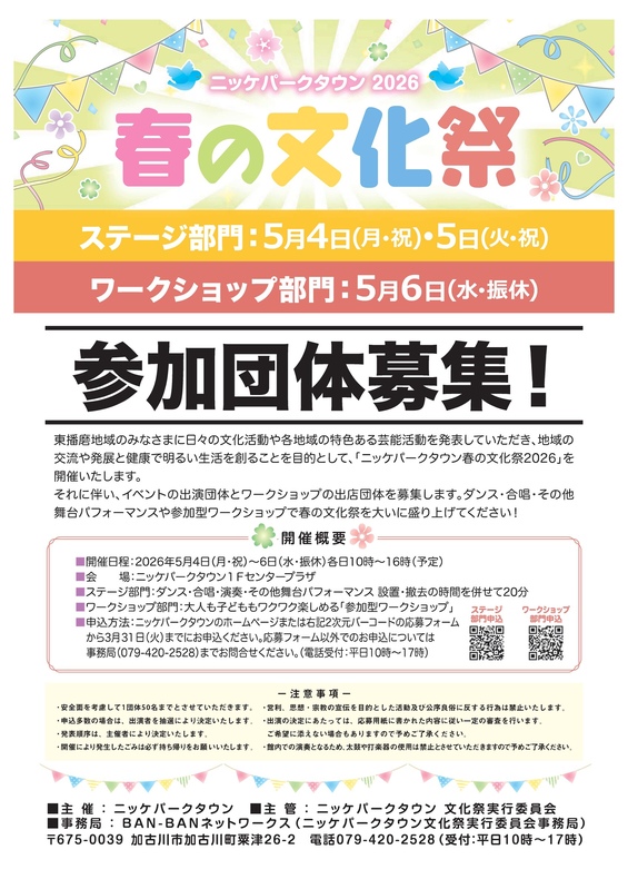 東播磨地域のみなさまに日々の文化活動や各地域の特色ある芸能活動を発表していただき、地域の交流や発展と、健康で明るい生活を創ることを目的として、「ニッケパークタウン春の文化祭2026」を開催いたします。