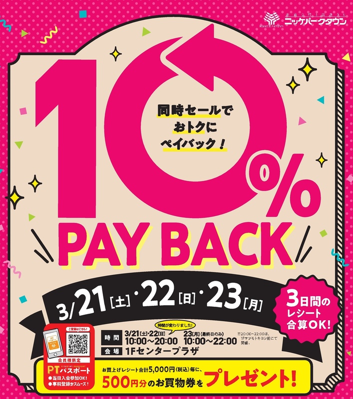 | 参加方法・参加料金 | ・PTパスポート会員登録が必要です! ・対象店舗のお買上げレシート合計5,000円(税込)ごとに 500円分のお買物券をプレゼント! 【お買物券有効期限:2026年4月30日(木)※ご使用できない店舗がございます】 ・対象店舗のレシートを会場へお持ちください。(3日間の合算可) |