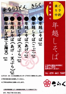 ・年越しそば 378円(税込) ・年越しそば(こぶ) 507円(税込) ・年越しそば(あげ) 529円(税込) ・年越しそば(天ぷら) 680円(税込) ・年越しそば(あげ、天ぷら)831円(税込) ・年越しそば(上海老天ぷら)842円(税込)