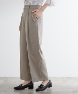センタープレス 入りのきれいめ ワイドパンツ。 ツイードライクな 素材とカルゼ組織の 素材を使用して、 クラシカルな ムードを持ち合わせた アイテムです♪ オフィスから お休みの日まで、 様々なシーンに 大活躍のアイテムです◎