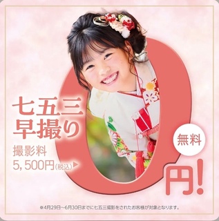 七五三は早撮りが断然おトク! 4月29日(水・祝)から6月30日(火)までに七五三撮影をされた方は撮影料5,500円(税込)が0円! 平日おでかけ用着物レンタルも0円になる特典もご用意しました。 ※レンタル0円は9月30日(水)までに撮影され、20,000円以上ご購入された方が対象です。