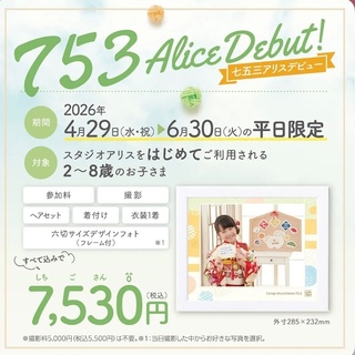 ⭐︎スタジオアリスをはじめてご利用される 2〜8歳のお子さま対象 ⭐︎撮影・ヘアセット・着付け・衣装1着・ 六切りサイズデザインフォト(フレーム付) 全て込みで7,530円!!