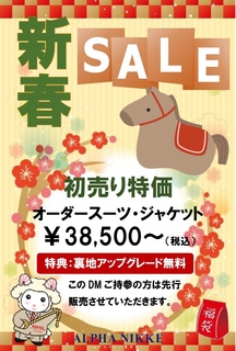 2026新春セールのご案内 オーダースーツ・ジャケット お仕立上り38,500円~(税込) 特典:裏地アップグレード無料 落ち着いた店内で、ゆっくり丁寧に採寸させていただきます。 スタッフ一同、心よりご来店お待ちしております