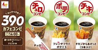 14時からドリンク+サイドメニューのコンビを390円から楽しめる「カフェコンビ」が登場。 チーズスティック、ふるポテから選べる490円カフェコンビも販売します。