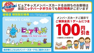 ピュアキッズのメンバーズカードをご提示されますと、 1枚でご家族全員、会員価格の100円引きでボウリングが楽しめちゃいます。 メンバーズカードをお持ちの方もそうでない方も これを機会に是非ご活用下さい!