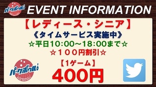【レディース・シニア サービスタイム実施中】 平日の10:00~18:00まで、1ゲーム 400円! (シニアは60歳以上の方が対象)