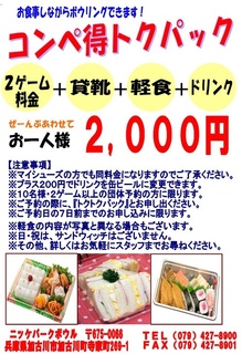 軽食、ドリンク代 その他もろもろ含めまして 『お一人様 ¥2,000-』でご提供させていただきます。 お得なプランとなっておりますので、是非ご検討ください。 ↓【参加者リストはこちらから】↓ https://www.nikkeparkbowl.com/reserve/index.php