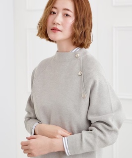 肩にあしらった 金釦がアクセントで、 トラッドなムードを 漂わせる ニットプルオーバー。