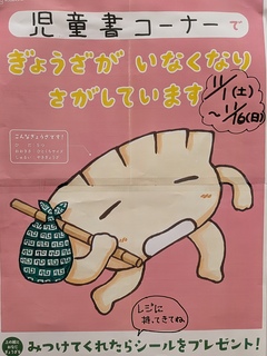 人気絵本「ぎょうざが いなくなり さがしています」の ぎょうざが、児童書コーナーにかくれているよ。 みつけてくれたら、シールをプレゼント! レジに持ってきてね。