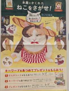 レジで参加用紙をもらって 児童書コーナーにかくれている、ねこをさがして キーワードをあつめよう。 全部みつけられたら、参加用紙をレジに持ってきてね。 プレゼントがもらえるよ。