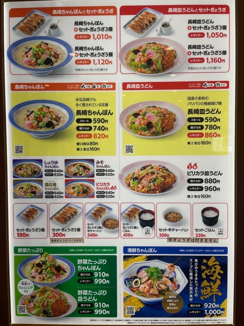 当店のグランドメニューです。定番の「長崎ちゃんぽん」「長崎皿うどん」をはじめ、人気の「野菜たっぷりちゃんぽん」、サイドメニューの「ぎょうざ」、「半チャーハン」など。ちゃんぽんや皿うどんはスモールサイズもあります!一部を除き、ほとんどの商品、テイクアウトもできます!